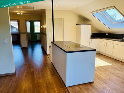 | Raumaufteilung: | Dachgeschosswohnung mit Wohn-Essraum und offener Küche, sowie anschließender Loggia, zwei Zimmer, Bad mit Dusche, Eckbadewanne und WC, Hauswirtschaftsraum mit Waschmaschinenanschluss, zwei kleine Abstellräume. In der Dachspitze (erreichbar über eine Deckeneinschubleiter in der Wohnung) befindet sich noch ein komplett ausgebauter Raum, der als Abstellraum genutzt werden kann. |